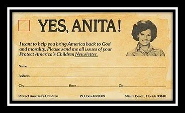 Bryant, la famosa cantante de música country, fundó Save Our Children (Salvemos a Nuestros Hijos), que trabajaba en tándem con la Mayoría Moral y buscaba denegar derechos y protecciones legales al colectivo LGBTQ, alegando su supuesta pederastia y el presunto peligro que supondría para un niño estar en contacto con alguien abiertamente homosexual. Un mensaje claro: a los gays, había que tenerles miedo.